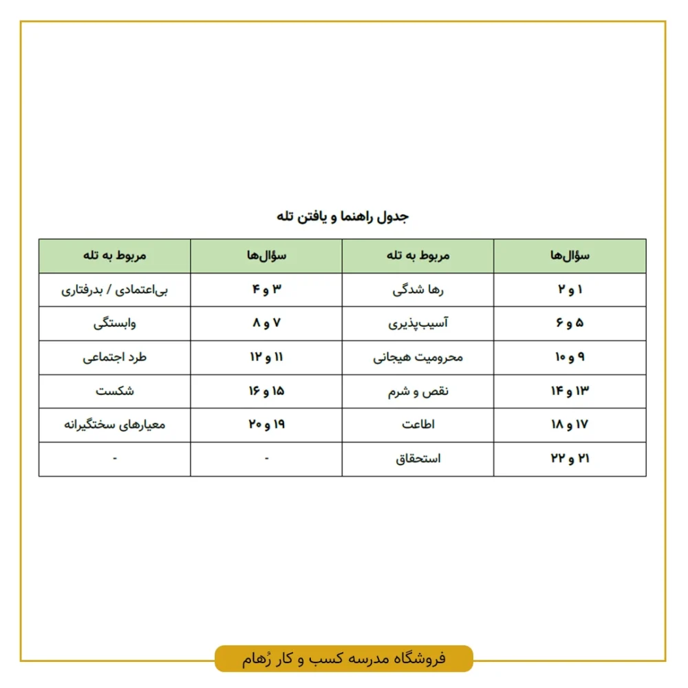به کمک “این پرسشنامه” که بیست و دو سؤال در آن قرار گرفته است، میتوانید به تلههای خود آگاه شوید. مهم این است که پرسشنامه را صادقانه، با حوصله و با نیّت کشف خود تکمیل کنید در غیر اینصورت، زمان را هدر داده و نتیجه خاصی دریافت نمیکنید. همچنین، اگر به بیش از پنج پرسش، امتیاز ۳ دادهاید، لازم است مجدد پرسشنامه را تکمیل کنید چون استفاده بیش از اندازه گزینه ۳، نشان میدهد که در حال فرار از واقعیت هستید نه تلاش برای روبرو شدن با آن.